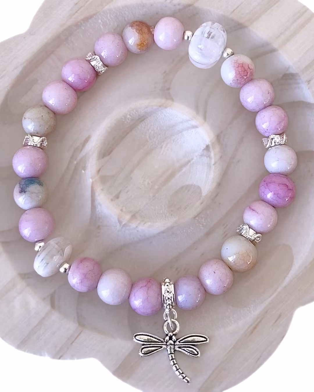 Handgjort, elastiskt armband med trollslända.