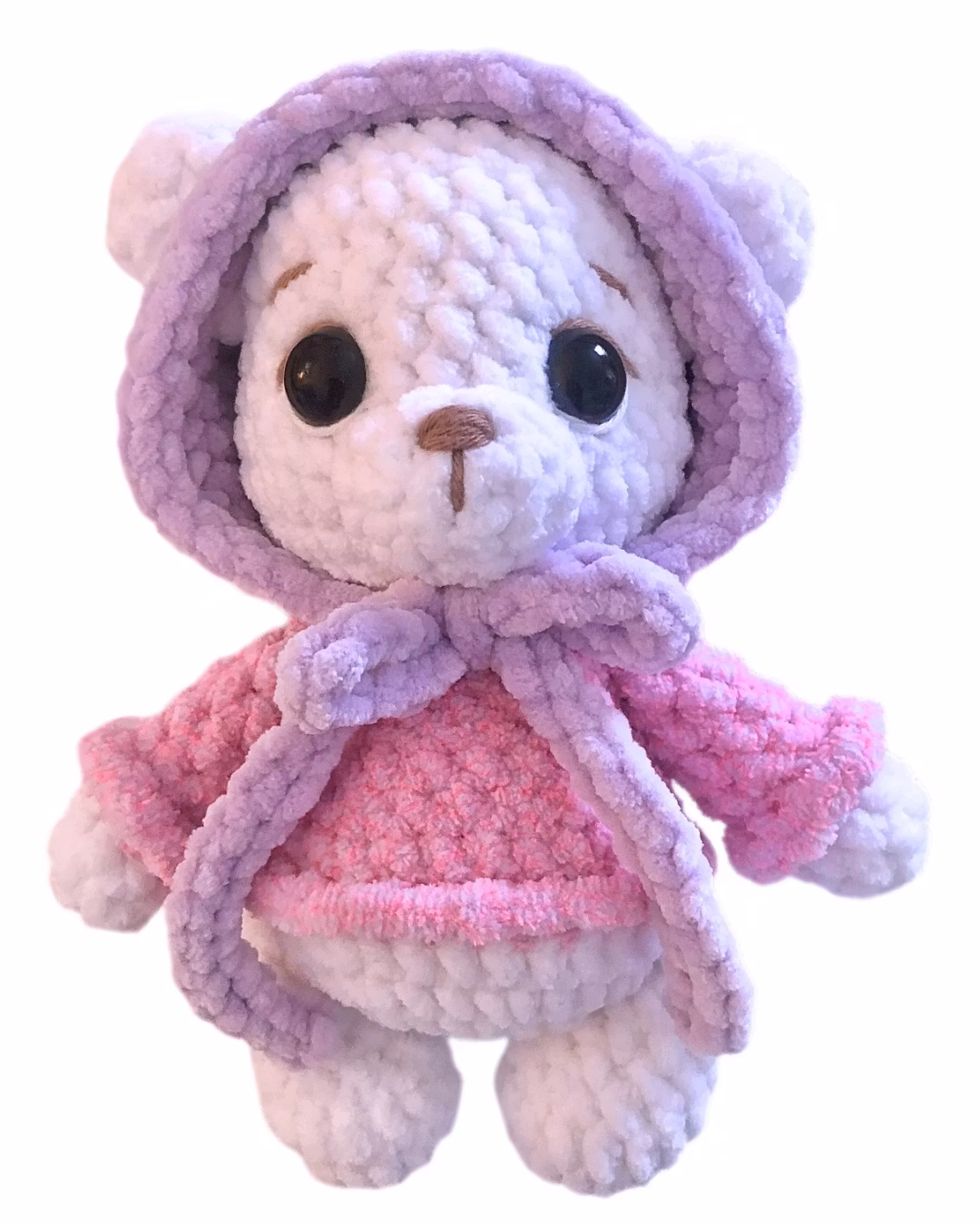 Nalle med rosa tröja och avtagbar lilaglittrig hätta med knytband.