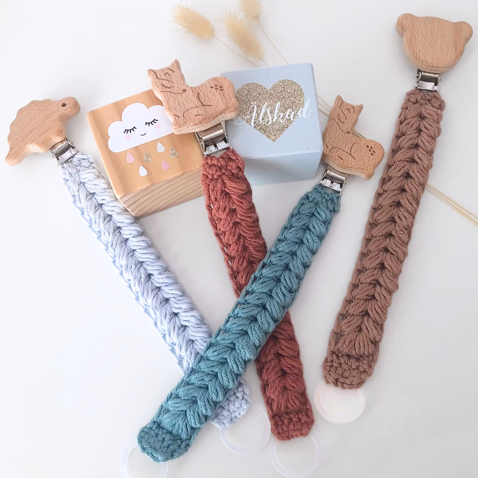 Virkad napphållare med flätad look i mjuk bomull. Träclips.