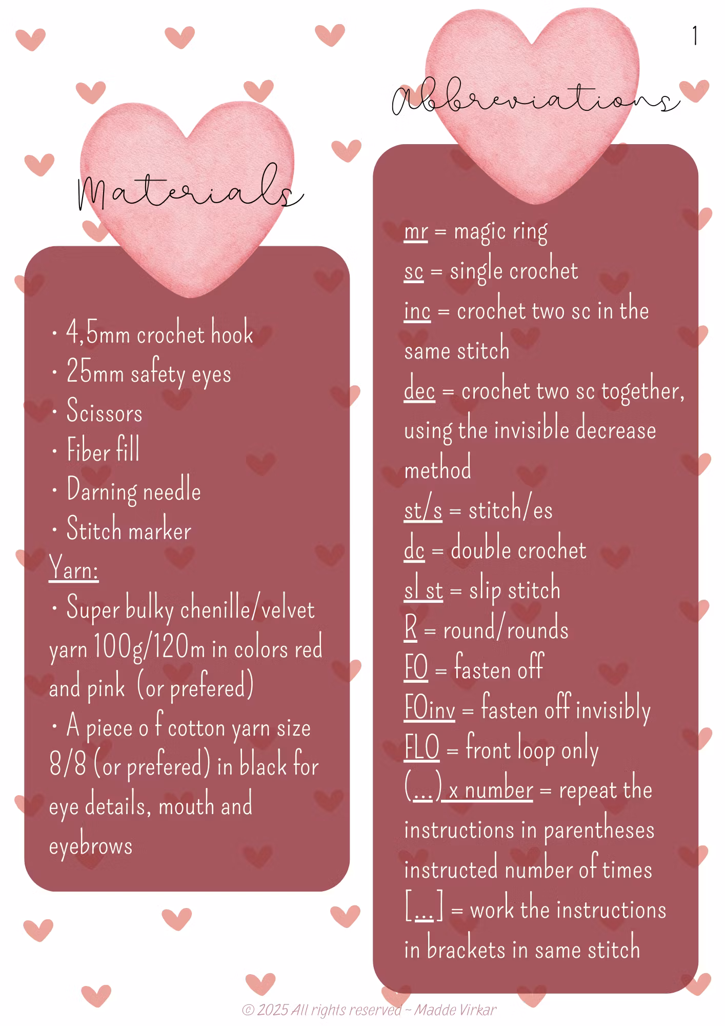 På bild 2 och 3 kan du se två av försättssidorna som visar vad mönstret innehåller samt, virktermer du bör vara (eller bli😊) bekant med samt vilket material som behövs (men du kan självklart välja annat garn och anpassa storlek på virknål därefter).